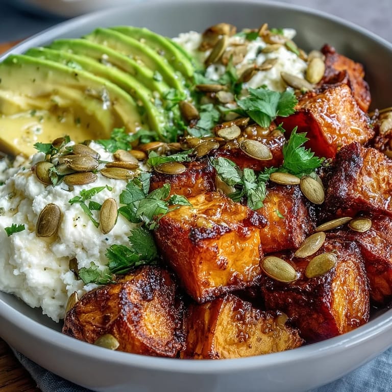 Save I discovered this bowl on a Tuesday afternoon when my fridge felt like it was staging an intervention. There sat a lonely avocado, some cottage cheese I'd bought with the best intentions, and sweet potatoes that were practically begging to be roasted. The magic happened when I drizzled hot honey over everything, and suddenly those humble ingredients transformed into something that tasted like I'd actually planned it.