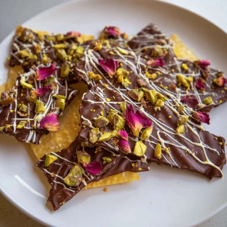 This bark keeps beautifully in an airtight container at room temperature for up to a week, though honestly it rarely lasts that long in my kitchen. Pair it with strong coffee, mint tea, or even a glass of something golden to really elevate the experience. The rose petals and pistachios aren't just pretty—they genuinely add flavor and make each piece feel special.