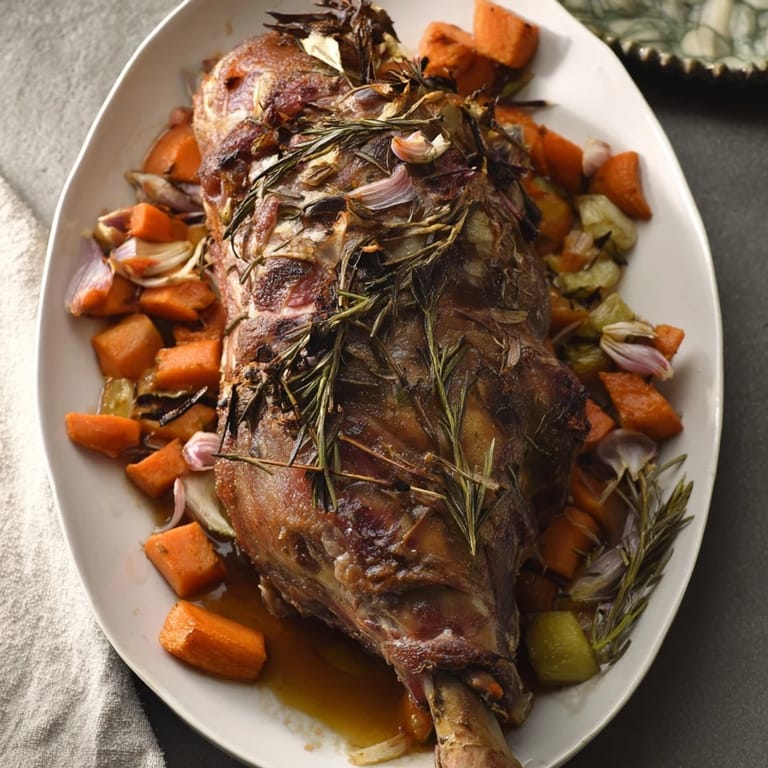 Fresh rosemary, thyme, and bay leaves add aromatic depth to the slow-roasted lamb.