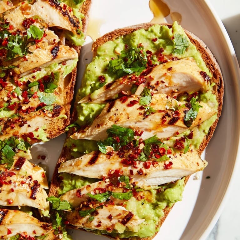 - Spread the smashed avocado evenly over each slice of toast, then layer the sliced grilled chicken on top. Finish with a sprinkle of chili flakes, a generous drizzle of honey, and fresh herbs if you like.